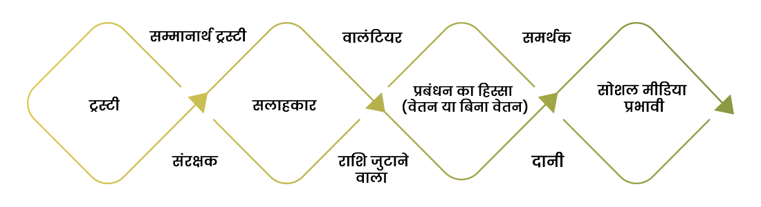 सभी सहयोगी व समर्थकों को मान्यता दी जाएगी, नामों को दर्शाया या गुप्त रखा जाएगा। भारत या विदेशों से कोई भी कॉरपोरेट, संगठन, सोसायटी, गैर सरकारी संस्था, व्यक्ति परियोजना के साथ सहयोगी या समर्थक के रूप में निम्न तरीके से जुड़ सकता है।